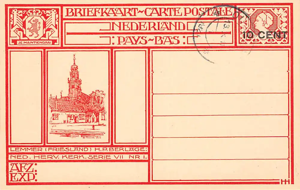 H.P. Berlage Serie VII Nr. 1. Afbeelding op briefkaart met 10 cents opdruk op 12,5 cent en met dagstempel 13 – X – 11 1927. Kleinformaat.