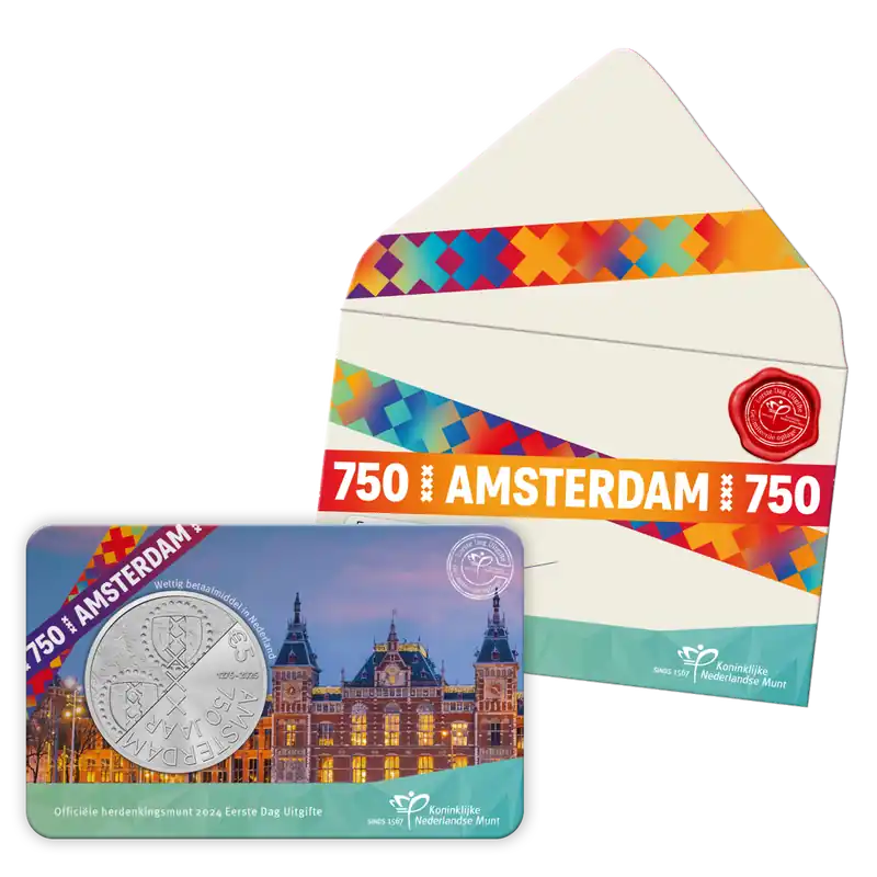 Onze hoofdstad viert feest! Vanaf 27 oktober 2024 tot 27 oktober 2025 viert Amsterdam haar verjaardag. En dat begint meteen groots, met de uitgifte van een speciale herdenkingsmunt. Slechts twee keer per jaar brengt de Koninklijke Nederlandse Munt, in opdracht van het Ministerie van Financiën, een herdenkingsmunt uit.Het 750 jaar Amsterdam Vijfje 2024 Eerste Dag Uitgifte is alleen verkrijgbaar op de dag van de Ceremoniële Eerste Slag, op 27 oktober 2024. Deze uitgifte is extra bijzonder omdat het gaat om een genummerde coincard in een speciale Eerste Dag Envelop met datumstempel. Dit maakt de munt extra gewild voor verzamelaars. De munt is gemaakt van verzilverd koper en steekt in een bijzondere coincard.Verzamel de iconen van Amsterdam: de coincards in BU-kwaliteit, UNC-kwaliteit en de Eerste Dag Uitgifte hebben elk de afbeelding van een iconisch gebouw in Amsterdam. Breng de iconen bij elkaar en verzamel de Sint Nicolaaskerk, het Koninklijk Paleis Amsterdam en Amsterdam Centraal.750 jaar Amsterdam: van rustig dorp tot bruisende wereldstadDe eerste keer dat we de naam Amsterdam, in de uitvoering Amestelledamme tegenkomen in de geschiedenis, is op 27 oktober 1275. Het is dan nog een klein dorp aan de Amstel, maar wel met een gunstige ligging voor handel. In 1275 krijgt Amsterdam officieel het tolprivilege: dit moment wordt dan ook gezien als de geboortedatum van de stad. Vanaf 1300, wanneer Amsterdam officieel stadsrechten krijgt, begint de stad echt te groeien. Onder andere de bezetting van Antwerpen door de Spanjaarden in de 16e eeuw en de industrialisatie zorgen ervoor dat Amsterdam uitgroeit tot de wereldstad die het vandaag is. Het jubileumjaar Amsterdam 750 wordt in 2024 en 2025 groots gevierd met tal van evenementen en initiatieven in en rondom Amsterdam. Verleden, toekomst en verbinding zijn de drie belangrijkste pijlers van het jubileum. Met de herdenkingsmunt onderstrepen we deze pijlers en is er voor altijd een schitterend aandenken aan 750 jaar Amsterdam.OntwerpHet 750 jaar Amsterdam Vijfje 2024 Eerste Dag Uitgifte is ontworpen door kunstenaar Hans Gremmen. De wisselwerking tussen toen en nu is goed zichtbaar, zowel op de voor- als de keerzijde van de munt. Op de voorzijde staat het portret van Koning Willem-Alexander. Hij is zo getekend door de kunstenaar dat zijn portret dezelfde stijl krijgt als die van voorgaande Nederlandse vorsten. De keerzijde van de munt bestaat uit twee helften. Op de ene helft staat een afbeelding van een oude merkentang uit 1350 met daarop het Amsterdamse stadswapen. Dit is naar verluid de eerste keer dat het stadswapen werd gebruikt. Deze helft van de munt heeft een matte finish. De andere helft bestaat uit hedendaagse typografie, waarmee de tekst ‘750 jaar Amsterdam’ en de jaartallen 1275 – 2025 zijn geschreven. Deze helft heeft een meer glanzende finish. Beide helften komen samen door de plaatsing van drie kruizen uit het Amsterdamse stadswapen in het midden van de keerzijde.De munt steekt in een coincard waar het iconische Amsterdam Centraal is afgebeeld op de voorzijde. Op de achterkant is een gedeelte van de officiële Amsterdam 750 slinger zichtbaar. Verzamel alle echte Amsterdamse iconen!