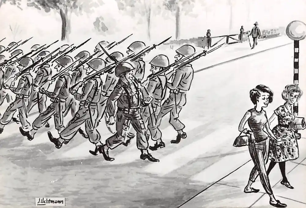 Zamów teraz Militair Soldaat uit de troep achter jonge dames aan Illustrator J. Uchtmann Humor Cartoon HC48804